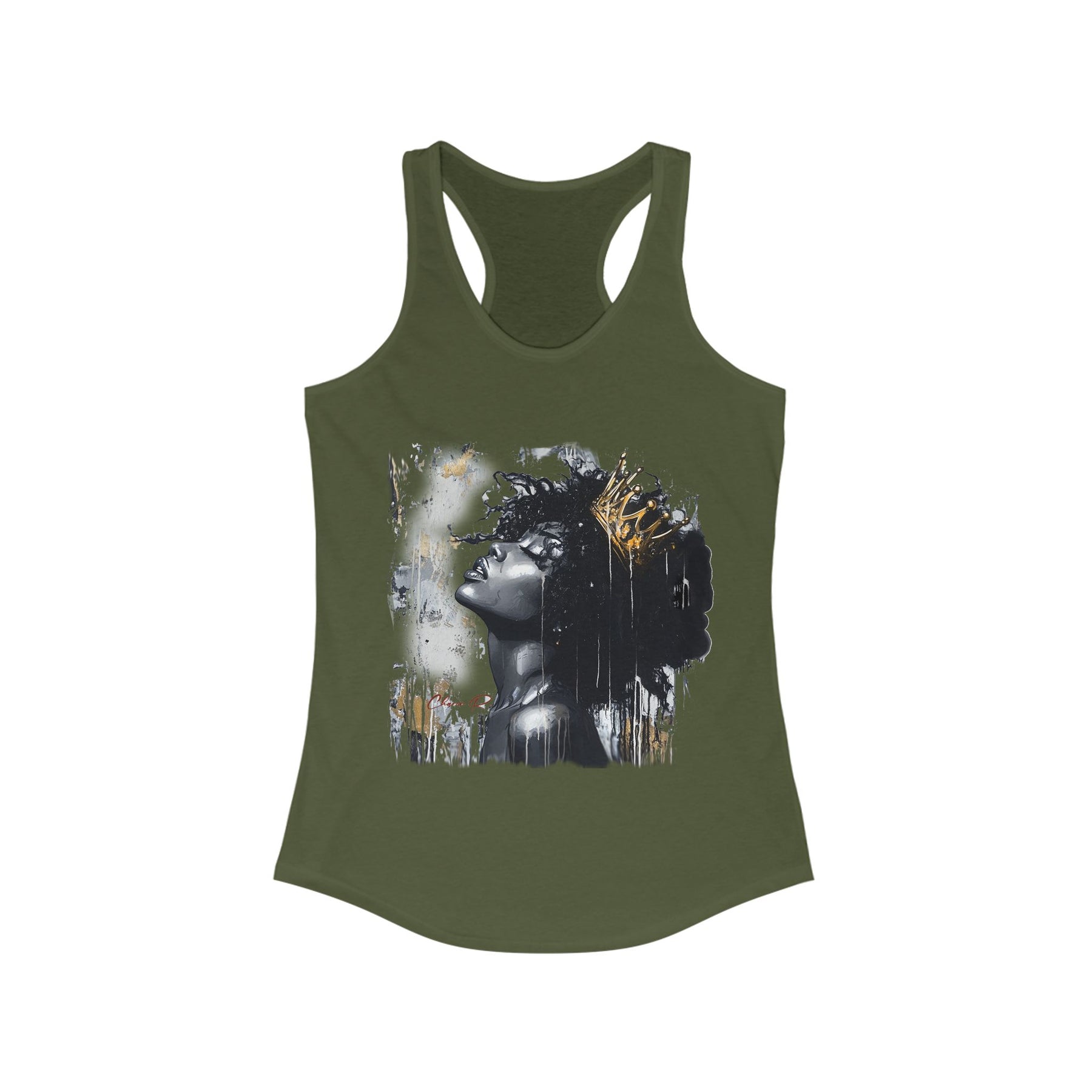 This Luxe Leisure piece is a love letter to the women who carry entire lineages on their backs and still find time to glow. Rendered in brushstrokes of grief, gold, and grit, this queen doesn’t wear her crown for decoration—it’s armor. Her upward gaze is not for show, it’s faith. This is the quiet storm of self-worth. The divine declaration that no matter how much the world tries to erase her, she reappears, louder, shinier, more sacred than ever.